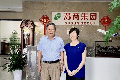 ↑陳家俊董事長(左一)和蔡亮主任( 右)在蘇商集團總部合影留念